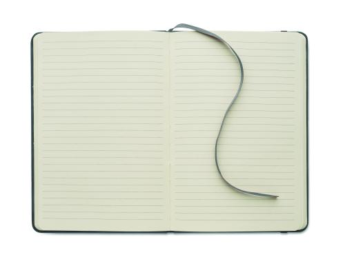 A5 notebook in 40% recycled post consumer smokey hard PU cover and 60% PU cover. Casebound. 160 lined pages, 70gsm recycled paper (80 sheets). Matching elastic closure strap and ribbon page marker.