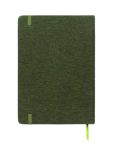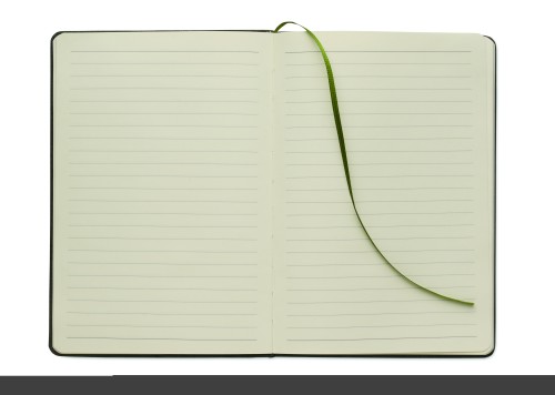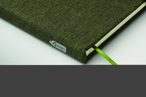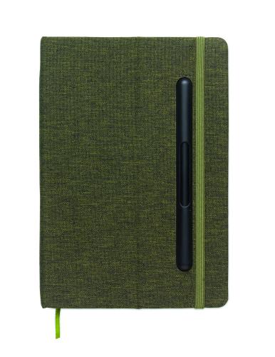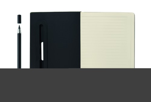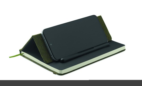 A5 notebook with RPET hard cover with phone holder functionality. Integrated 2-in-1 inkless and regular ballpen in ABS. Casebound. 192 recycled paper lined pages (96 sheets). Matching strap and bookmark.