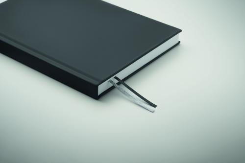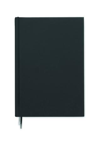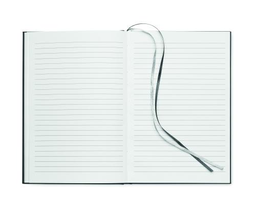 A5 journal notebook in 60% recycled post consumer polyester and 40% PU cover. Casebound. 256 lined pages in 70gsm recycled paper (128 sheets). With 2 polyester ribbon page markers.