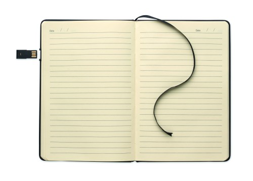 A5 notebook in hard cover made of 58% recycled polyester and 42% PU including integrated 16GB USB stick. Casebound. 160 lined recycled paper pages (80 sheets). Matching elastic closure strap and ribbon page-marker. FSC®-certified | FSC MIX CREDIT, P7.1, FSC-C213206