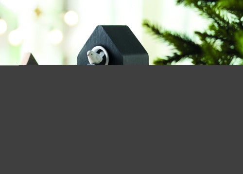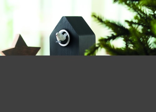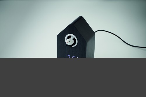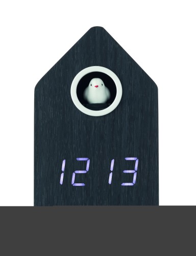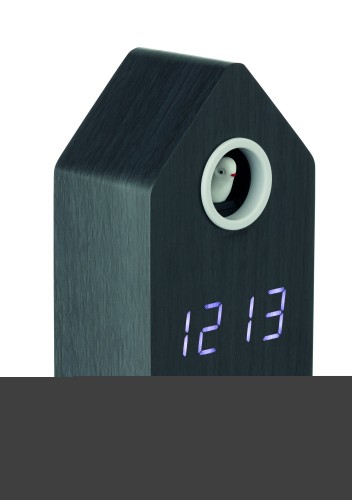 MDF cuckoo clock including a built-in alarm / temperature display. Bird will come out every full hour and during alarm and it has bird cuckoo voice. White LED display. Sound is automatically silenced between 22.00h to 06.00. 5 mins snooze intervals.