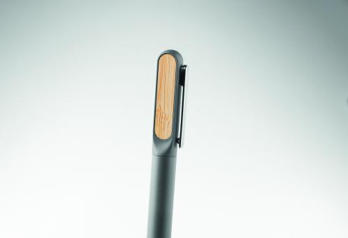 Twist ballpen with recycled aluminium barrel, recycled ABS twist part, and metal clip with bamboo detail. Blue ink.