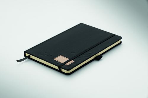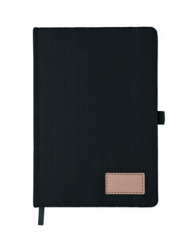 A5 notebook with hard RPET polyester corduroy cover and 192 lined recycled paper pages (70 gr/m2). Casebound design with elastic band closure, pen loop, ribbon page marker, and washed kraft paper tag.
