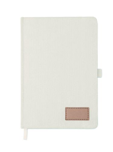 A5 notebook with hard RPET polyester corduroy cover and 192 lined recycled paper pages (70 gr/m2). Casebound design with elastic band closure, pen loop, ribbon page marker, and washed kraft paper tag.
