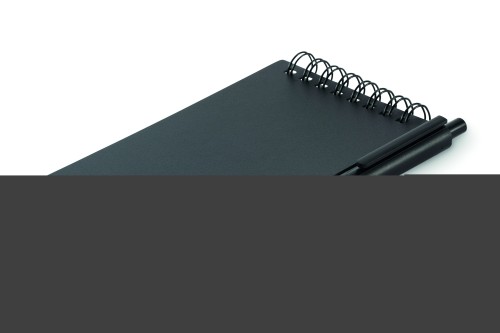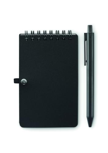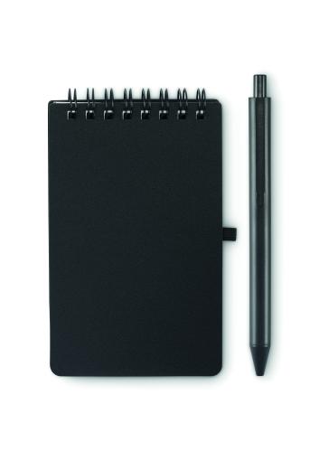 Water repellent notepad in PP cover with pen. Twin-wire. Mineral paper 120 gr/m², 50 sheets lined. Blue ink. Elastic closure strap and pen holder.
