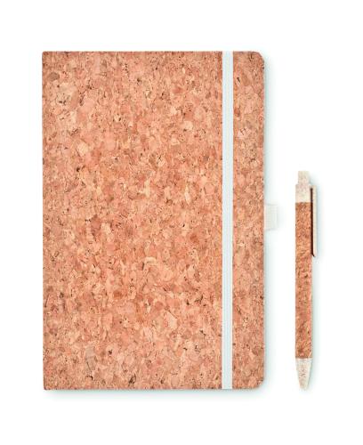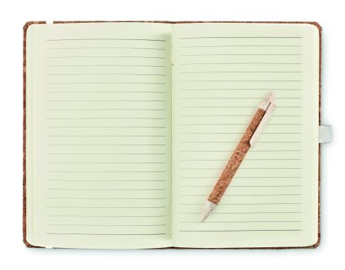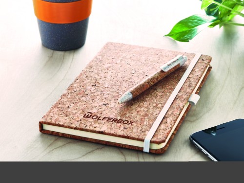 A5 cork notebook with matching pen. Hard cork cover. Casebound. 160 lined recycled paper pages (80 sheets). Elastic closure strap and pen holder. Matching push button ball pen with cork barrel and 50% wheat straw and 50% PP details. Presented in a gift box.