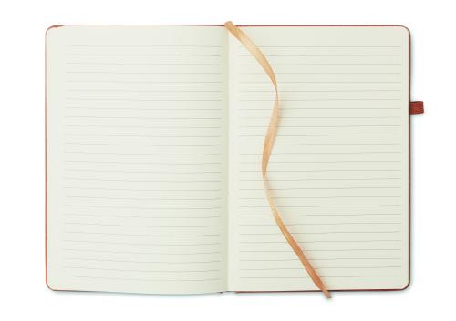 A5 notebook with 70% recycled pre-consumer leather and 30% latex PU cover. Casebound. 160 lined pages recycled paper (80 sheets). Matching elastic closure strap and pen holder.