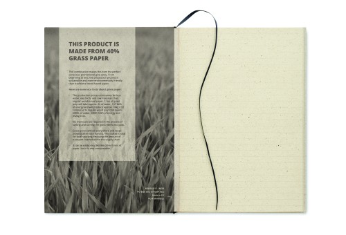 A5 notebook with 80 sheets of lined grass paper and carton cover. Ideal for all your notes during office meetings or at school. Grass paper makes for a perfect conscious promotional give-away. From beginning to end, the production process is sustainable and more environmentally friendly than traditional wood-based paper. Made in EU.