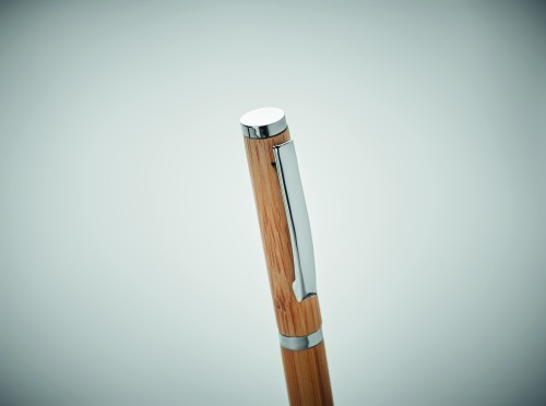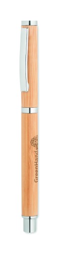 Bamboo barrel roller ball pen with stainless steel fittings. Blue gel ink. Take your notes during important meetings with this gel pen. The sustainable and natural bamboo material gives it a modern and stylish look. Bamboo is a natural product, there may be slight variations in colour and size per item, which can affect the final decoration outcome. FSC®-certified | FSC 100%, N10, FSC-C213206