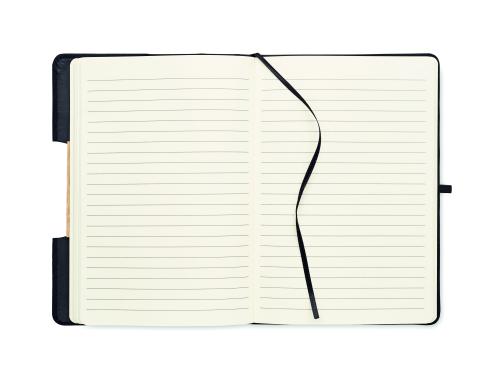 A5 notebook with 600D RPET hard cover with bamboo detail with a smartphone stand function. Casebound. 160 lined pages (80 sheets). 70 gsm recycled paper. Matching elastic closure strap, ribbon page-marker and pen holder. Take this office essential with you to your next meeting. Having a remote meeting? Fold open the phone holder and put in your device so you don't have to hold it yourself. FSC®-certified | FSC MIX CREDIT, P7.1, FSC-C213206