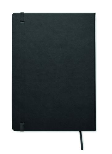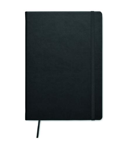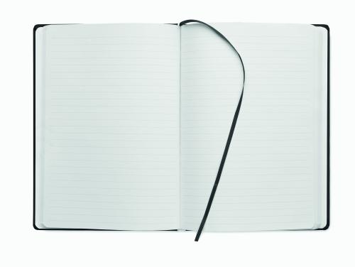 A5 notebook with hard PU cover. Casebound. 200 lined pages (100 sheets) in recycled paper (80 gsm). Matching elastic closure strap and ribbon page-marker. Made in EU.