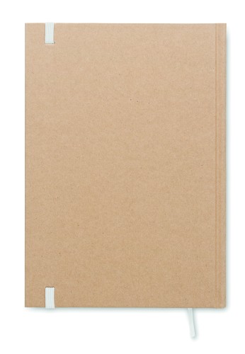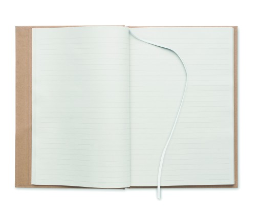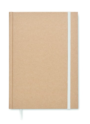 A5 notebook with hard recycled carton cover. Casebound. 200 lined recycled paper pages (100 sheets/80 gsm). Elastic closure strap and ribbon page-marker. Made in EU.