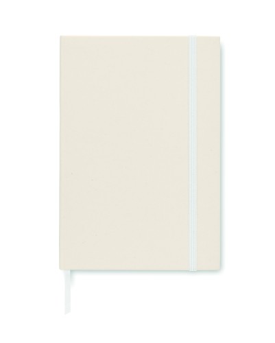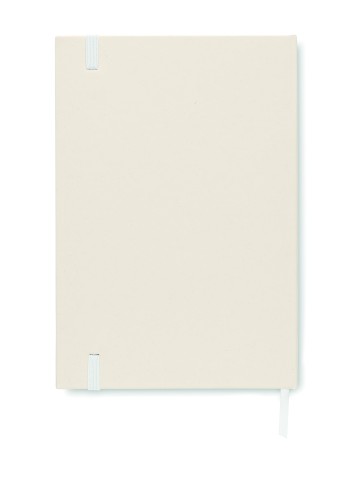 A5 notebook with hard cover made of 70% recycled milk carton pack and 30% recycled paper. Casebound. 160 lined pages (80 sheets 80 gsm) made of recycled paper. Elastic closure strap, ribbon bookmark.