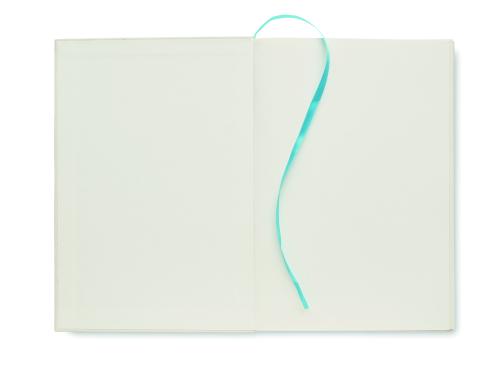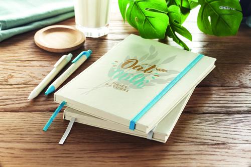 A5 notebook with hard cover made of 70% recycled milk carton pack and 30% recycled paper. Casebound. 160 lined pages (80 sheets 80 gsm) made of recycled paper. Elastic closure strap, ribbon bookmark.