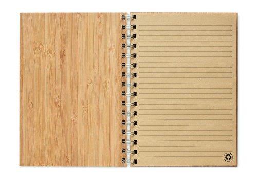 Bamboo cover notebook. Twin-wire ring bound, 140 lined kraft paper pages (70 sheets). Bamboo is a natural product, there may be slight variations in colour and size per item, which can affect the final decoration outcome.