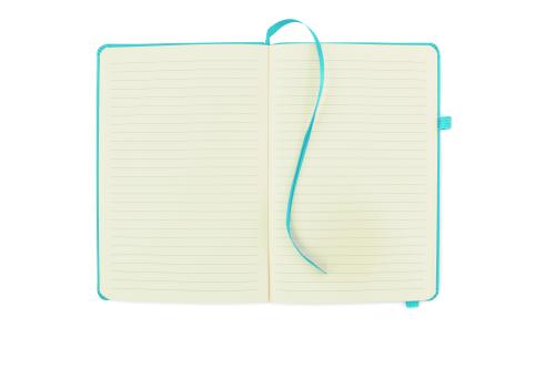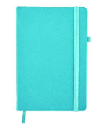 A5 notebook with 70% recycled pre-consumer leather and 30% latex PU cover. Casebound. 192 lined pages recycled paper (96 sheets). Matching cotton elastic closure strap and pen holder.