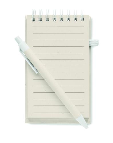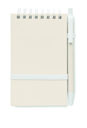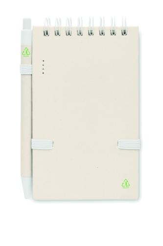 A6 Recycled milk cartons 70 sheet recycled plain paper notebook (70 % recycled milk carton and 30% recycled paper) with matching pen. Ring bound. Matching push button ball pen. Blue ink. Elastic closure strap and pen holder.