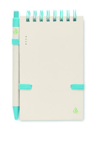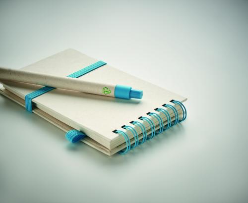 A6 Recycled milk cartons 70 sheet recycled plain paper notebook (70 % recycled milk carton and 30% recycled paper) with matching pen. Ring bound. Matching push button ball pen. Blue ink. Elastic closure strap and pen holder.