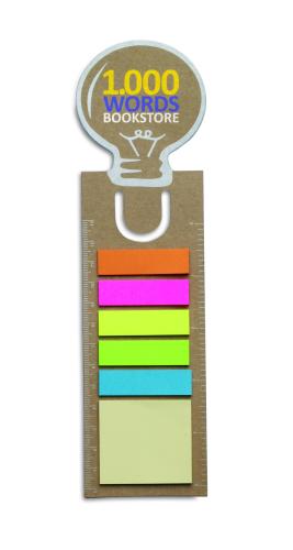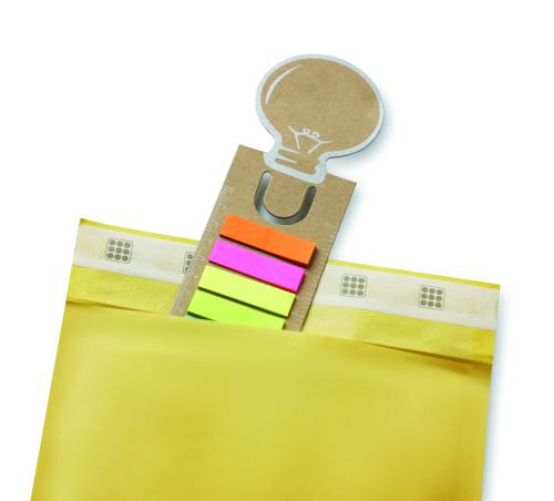 Lightbulb-shaped bookmark in recycled carton. 2 piece sticky note memo pad. Medium yellow recycled paper sticky notes pads and 5 assorted colours page markers. 13 cm ruler.