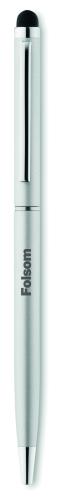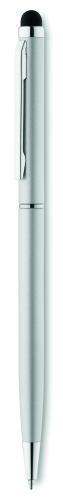 Twist action ball pen in recycled aluminium with stylus and shiny chrome clip. Blue ink.