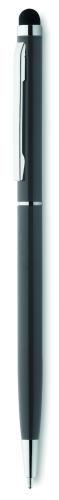 Twist action ball pen in recycled aluminium with stylus and shiny chrome clip. Blue ink.