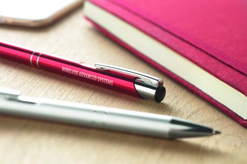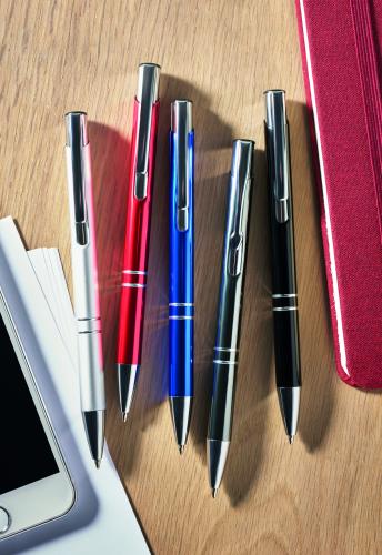 Push button ball pen in recycled aluminium. Blue ink. A classic and simple designed office essential. The aluminium barrel gives it a more premium look.