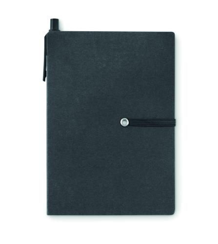 Recycled carton notebook with sticky notes pad and pen. Soft recycled carton cover noebook. Casebound. 140 lined pages (70 sheets). Large and medium sticky notes pads and 4 assorted colours page markers. Matching push button ball pen in recycled carton and ABS details. Black ink. Matching elastic closure strap. FSC®-certified | FSC MIX CREDIT, P7.1, FSC-C213206