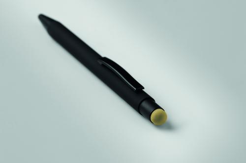 Push button stylus pen in aluminium. When the logo is engraved on to the barrel, the colour revealed matches the colour of the touch tip. Blue ink.
