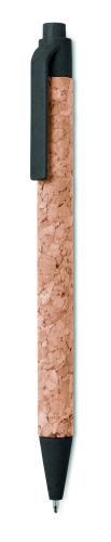 Push button ball pen with cork barrel and Eco-friendly wheat straw (50%) and ABS plastic (50%) fittings. Blue ink. Cork is a natural material, due to its structural nature and surface porosity the final print result per item may have deviations.
