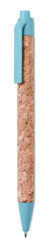 Push button ball pen with cork barrel and Eco-friendly wheat straw (50%) and ABS plastic (50%) fittings. Blue ink. Cork is a natural material, due to its structural nature and surface porosity the final print result per item may have deviations.