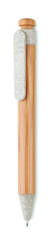 Push button ball pen with bamboo barrel and wheat straw (50%) and ABS (50% ) fittings. Blue ink. Bamboo is a natural product, there may be slight variations in colour and size per item, which can affect the final decoration outcome. FSC®-certified | FSC 100%, N5.7, FSC-C213206