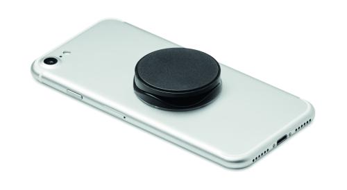 Round shaped foldable phone accessory in ABS with two functions: phone stand and holder. It has 3M sticker on the back.