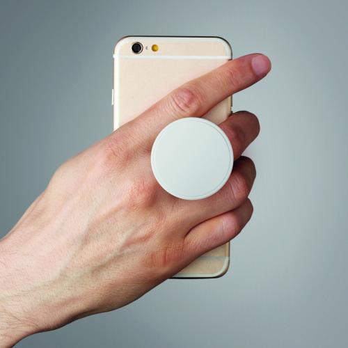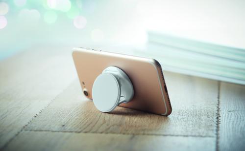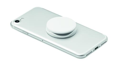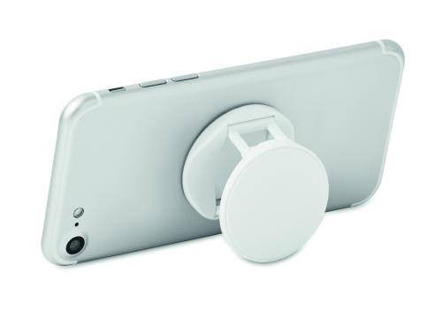 Round shaped foldable phone accessory in ABS with two functions: phone stand and holder. It has 3M sticker on the back.