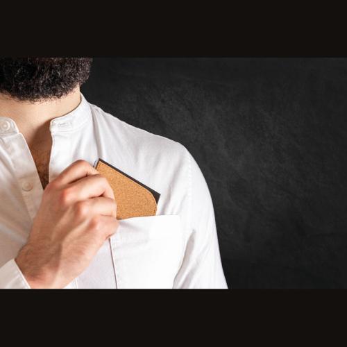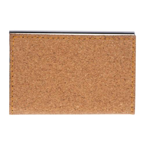 Metal Business Card Holder with cork surface and magnetic catch.