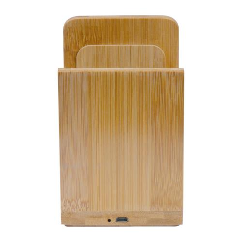 Bamboo wireless charger with pen holder. When the charger is fully loaded, the green light will shine. Cable included.