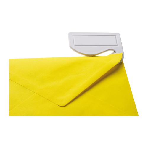 Practical and comfy white plastic letter opener with a sharp blade.