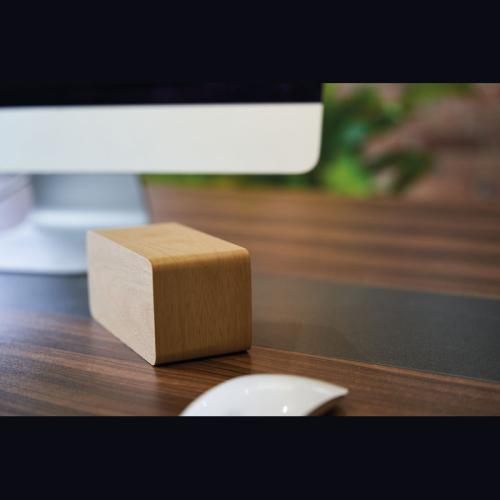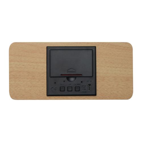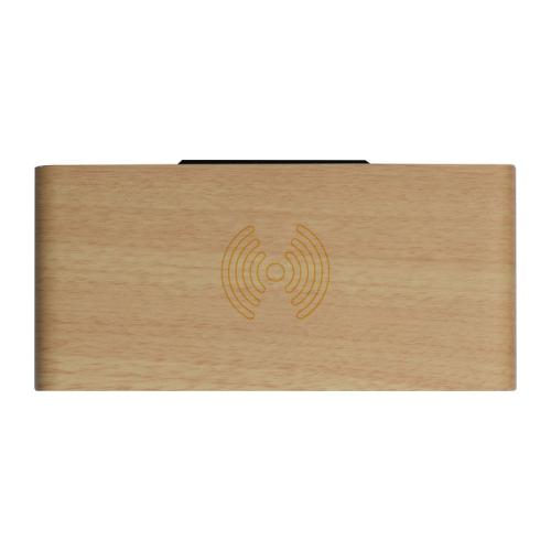 Bamboo desk clock with smartphone holder, wireless charger, and storage compartment. USB charging cable included.