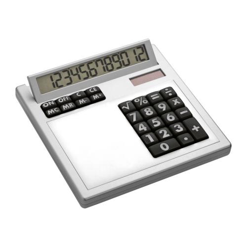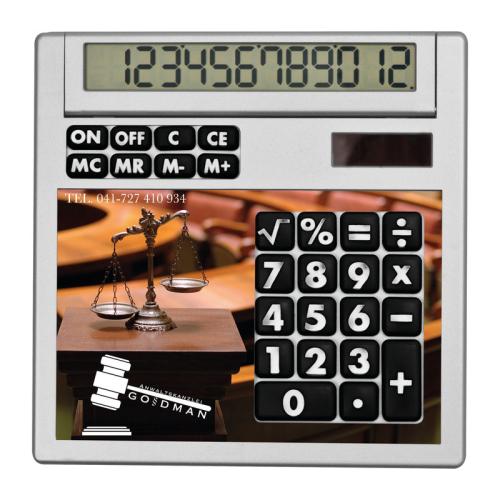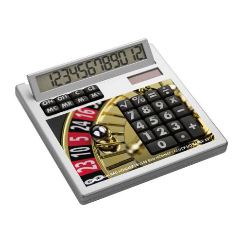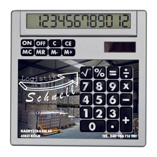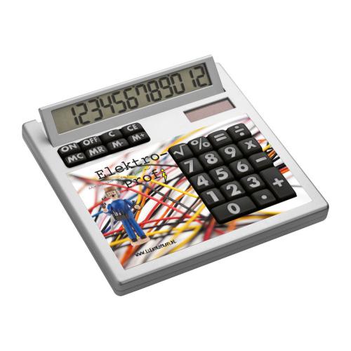 CrisMa design desk calculator with 12 digits and solar power made of silver plastic. Unique, thanks to the digital printing possibilities -create your calculator just as you like.