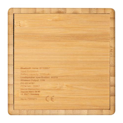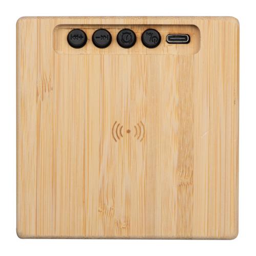 Bluetooth speaker (version 5.3) made of bamboo with wireless charger up to 15 watts and digital time display, alarm function and temperature display. The rechargeable battery has a capacity of 1200 mAh / 3.7 volts.
