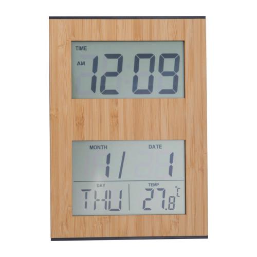 Bamboo desk clock with display for time, date, and temperature, operates with 2 AAA batteries, not included in the package. The housing features an elegant bamboo front, making it a perfect fit for any desk or bedside table.