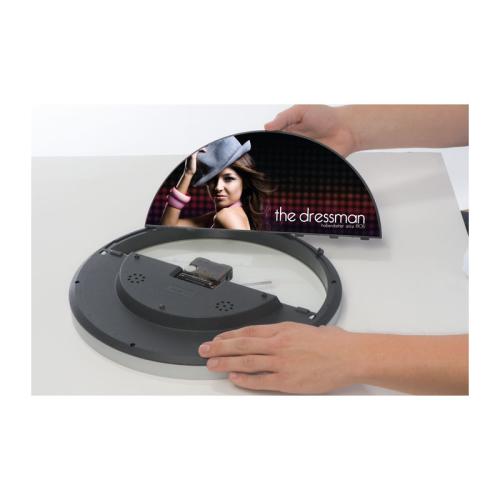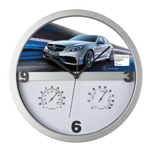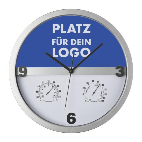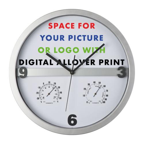 Stylish wall clock with hygro and thermometer - the key is that half of the display can be easily taken out and printed allover. Endless possibilities for printing your logo!