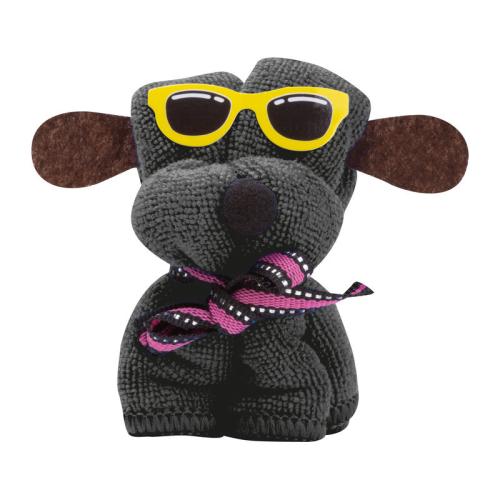 Soft microfiber cloth (20 x 20 cm) folded in the shape of a dog and packaged.