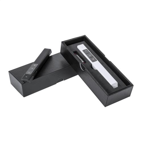 Plastic laser pointer with LED light and presentation remote function. In paper gift box. With 1 AAA battery.