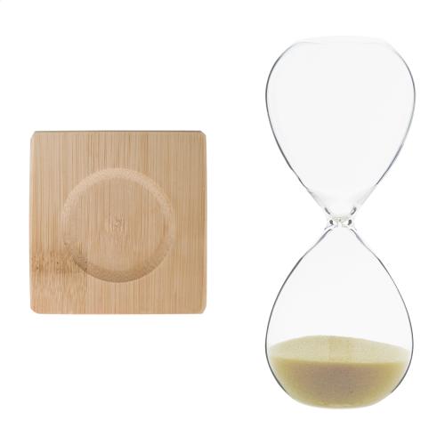 5-minute borosilicate glass hourglass sand timer with bamboo base. In kraft paper box.