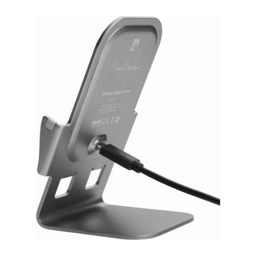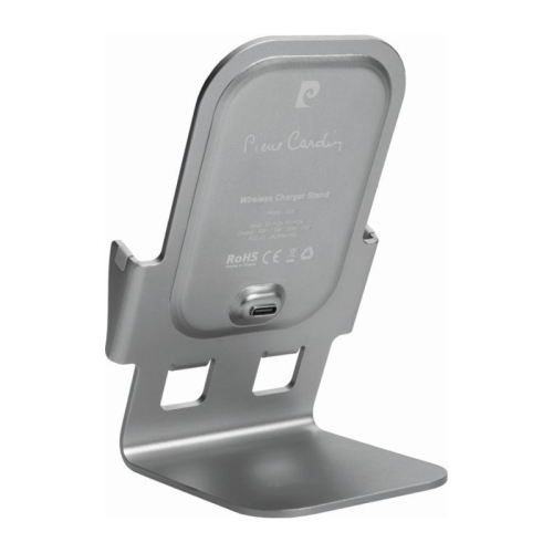 Elegant Pierre Cardin phone stand with 15W wireless charging function. It is suitable for all types of smartphones and iPhones. The phone can be inserted into the stand in either a vertical or horizontal position. The stand is made of aircraft-grade aluminum and is covered with an elegant gray fabric. Input 9V/2A, 12V/1.5A (USB-C PD). It has protection against overheating and overvoltage. The package includes a charging cable with a Type-C connector. Packed in a gift box, comes with a certificate of authenticity.