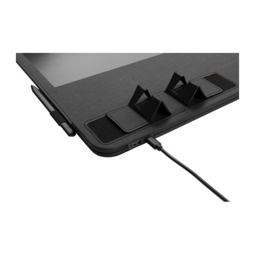 An elegant multifunctional Pierre Cardin office mouse pad with a leather-like surface. The mouse pad contains a 10W wireless charger with 5V/2A 9V/1.67A input and 5V/1A 9V/1.1A output, a mobile phone stand, an erasable writting pad with a stylus pen, two pen loops, a glass with backlight for placing your logo and an extra USB input. The mouse pad is rechargable by an USB-C cable which is included in the package. Packed in a gift box, comes with a certificate of authenticity.