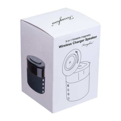 5-in-1 5W Bluetooth 5.4 speaker from Ferraghini with integrated wireless charger for a smartphones, AirPods, and Apple Watches, comes with a USB-C cable. 1800 mAh battery, runnig time 4-6 hours. Features LED sleep light.