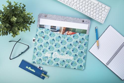 Custom made, RPET felt document folder (A4 size) with full colour printed front side and press-stud closure. With distinctive RPET label. Price includes sublimation printing. MOQ: 25 pcs.