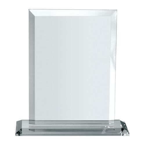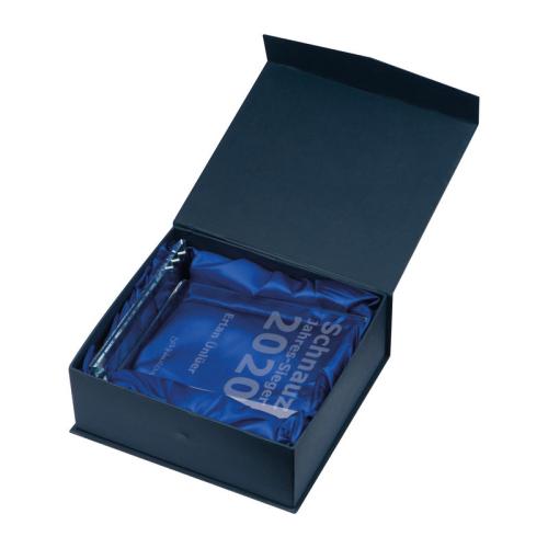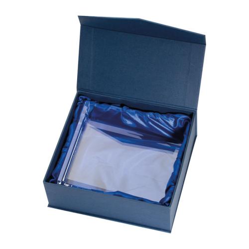 Elegant glass award, safely packed in a blue box with satin inlay.