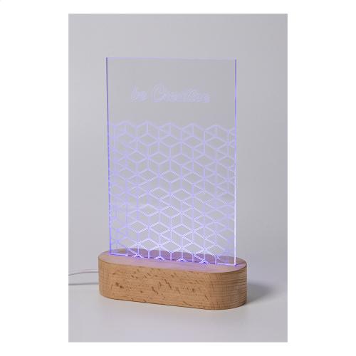 Custom made acrylic trophy on wooden base with USB powered multicolour LED light. In unique shape with engraved graphics. With USB charger cable. Price includes engraving. MOQ: 10 pcs.